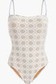 Printed One-piece with high back. Curved neckline with silicone trim inside for a better support. Removable and ajustable straps for more swimming comfort. Removable cups.