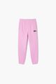 Relaxed fit, comfortable cut, width leg. Elasticised waistband with drawstring. Elasticised ankles. Embroidered crocodile sewn onto front. Organic unbrushed cotton fleece.