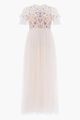 Tulle decorated with floral embroidery and sequins. Bodice is partially lined. Sleeves are un-lined. Skirt is fully lined. 100% Recycled Polyester. Concealed zip at centre back.