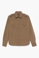 Front button closure with a western or military-style aesthetic. Functional epaulets at the shoulders. Two buttoned flap chest pockets. Buttoned cuffs and a curved hem.
