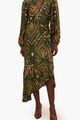 The charm of Ikat patterns is complemented by the delicate touch of embroidery, adding a unique textural contrast. With a flattering V neckline and gently cinched waist, this piece flows into a graceful midi silhouette that dances around the legs with every step, creating an ensemble that whispers tales of tropical escapes and warm, breezy evenings.
