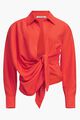 Tied-sash shirt. Twisted, straight fit. Pointed collar. Plunging, draped neckline. Hidden button under the sewn knot. Square cuffs with mother-of-pearl buttons.
