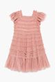 It features an all-over textured effect created by gathering soft tulle panels. The dress has short sleeves and multiple underlayers of tulle to provide significant volume for twirling.