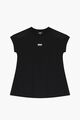 Black dress for girls by iconic designer brand DKNY. Made from soft cotton jersey, it features the brands logo print in white on the chest and has embroidered logo and mesh details on the shoulders.