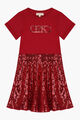 Stunning red dress for girls by luxury designer MICHAEL KORS. Made from soft cotton jersey, the red bodice has the brands logo on the front in red shimmering sequins. A full sequin skirt which is lined for comfort. 100% Polyester Lining 100% viscose