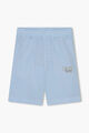 Light blue, linen and cotton blend, logo print on the front, tone-on-tone stitching, elasticated waist, two pockets with inserts, two back patch pockets. 65% lyocell, 18% cotton, 17% linen.