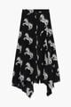 GOTS-certified organic silk crêpe de Chine. All-over alabaster white pixelated horse print. Flat waistband. Button-through front. Asymmetric hem.