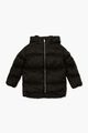 Versace Kids black down jacket for boys. Goose down padding, padded design, high neck, front zip closure, hood, long sleeves, and straight hem. 100% polyester, 80% goose down, 20% feathers.
