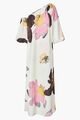 Long dress in off-white with hand-painted floral print, asymmetrical off-shoulder neckline and short puff sleeves with elastic at the hem. Fully lined for optimal comfort.