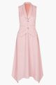 Tailored pink midi dress featuring a vest-style bodice with a collared V-neck and elegant metal T-bar front clasps. The design is completed with a flowy asymmetrical skirt and a tonal crepe back that can be styled either tucked or open, accented with a delicate bow detail.