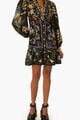 This charming piece features a striking collar neckline that flows into an alluring silhouette, adorned with vibrant, hand-painted florals and spirited foliage against a timeless black canvas. Gentle ruffles at the hem add a touch of whimsical flair, inviting you to twirl in its playful elegance.