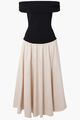 Adaline dress is designed with a black recycled satin-jersey bodice contrasted by a beige linen-blend skirt. It sits elegantly off the shoulders and has a gathered dropped waist that enhances the floaty shape