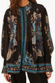 The high neckline and smocked details are a canvas for the intricate tapestry of florals and bees, set against a deep black backdrop. Highlighted by azure touches, this blouse's flowing silhouette promises to transport you to a world of romantic whimsy with every wear.