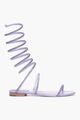 Perfect for day or night, this satin and leather pair features the signature serpent-like strap that coils around the ankle, finished with delicate crystal embellishments around the lightly padded footbed, a soft, almond-shaped toe, and a durable rubber outsole.