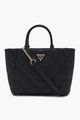 Pebbled faux-leather tote bag Diamond-quilted Gold-tone hardware and raised enamel signature emblem Large trapezoid silhouette Split-compartment construction Top zip closure Dual rolled top handles with 5" drop Detachable crossbody strap with 15" drop