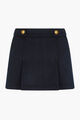 A pleated mini skirt featuring a concealed side zip fastening, two side slash pockets, and a button accent at the waist. The outer shell is a luxury blend of 80% Virgin Wool and 20% Cashmere, with a felted finish.