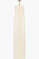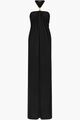 Halterneck Racer Back Evening Dress. Full Length. Amber Vintage Gold Metal Hardware Detail on Neckline and Back. Invisible Zip. Crafted in Crepe Viscose Jersey.