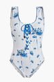 Women's one-piece swimsuit. Scooped neckline front and back. Front slit and lacing. Removable padding. Turtle shell imitation Vilebrequin plate.