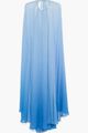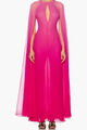 Partially lined. Back tie-up closure. Hidden back zipper closure. Cut-out detail at front. Chiffon fabric with cape design overly.