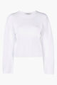 White rib knit blouse made of synthetic fibers, with pleated effect, round collar, long sleeves with a loose fit, elastic fabric and unfinished hem.