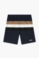 Navy blue swim shorts for boys by BOSS. Made from silky fabric, they feature the brands signature striped in beige, white and black, they have the brands logo print in white on one leg. They are lightweight, with a mesh lining and an elasticated drawstring waist. Comes with inner attached mesh brief.