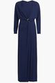 Designed with a gentle drape across the bodice, cinching at the waist, and subtle twist detailing that leads to a full-length flowy skirt. Its long sleeves and refined silhouette offer a blend of classic sophistication and contemporary grace.