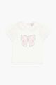 The top is detailed with a contrast white satin collar, voluminous puffed sleeves and pretty bow diamante embellishment on the front. Fastens at the back with gold logo button.