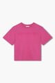 Made from soft, 100% organic cotton, it features a comfortable crew neck and short sleeves. The embroidered pink logo adds a stylish touch.