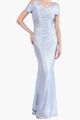 V neckline. Short sleeves. Body-conscious silhouette. Draped. Mermaid silhouette. Floor length.