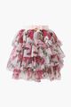 Rose print. Elasticated waistband. Bow and heart charm. Tiered ruffles.