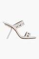 Sculptural mule featuring a perforated shaped metal heel; insole lightly cushioned.