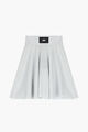 Made from a shimmering silver plisse fabric, it features a black and white logo badge on the elasticated waistband.
