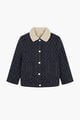 This reversible jacket features press-stud fastening and long sleeves. One side is made of fluffy fabric with embroidered badges, while the other side has an all-over decorative print material with a logo label.