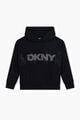 Black hooded top for girls by DKNY. Made from soft cotton, it features the brands logo in embellished rhinestones on the front. Hoodie neck and long sleeve with ribbed cuff and hem.