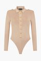Long Sleeve Ribbed Knit Bodysuit Shoulder Epaulettes. Shoulder Pads. Polo Neckline with Deep Buttoned Placket.