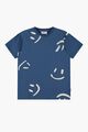 Blue t-shirt made of soft organic cotton with short sleeves and a ribbed collar. The t-shirt has a loose fit with an all-over print of off-white smileys.