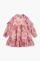This dress showcases a pure wool gauze bodice adorned with a vibrant spiral print. Romantic ruffles at the sleeves and neckline add a charming touch. The dress is lined with cotton and features a concealed back zipper.