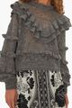Its elegant high neckline complements the cascade of ruffles that dance along the shoulders, creating a silhouette that’s both graceful and spirited. The intricate cable knit pattern whispers tales of artisanal crafts, while the soft grey hue becomes a versatile backdrop for endless style narratives.