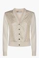 This Tory Burch cardigan features a knitted construction with paneled design and silk paneling. It has a monogram pattern, front button fastening, V-neck, and long sleeves with ribbed cuffs and hem.