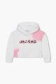 Cropped hooded sweatshirt with a front kangaroo pocket, the sweatshirt has a large sprayed spots design and a fancy Marc Jacobs tag logo on the front.