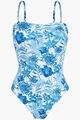 Printed one-piece swimsuit with high back. Curved neckline with silicone trim inside for a better support. Removable and adjustable straps for more swimming comfort. Removable cups.