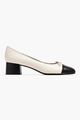 Characterised by the contrasting cap-toe detail in black leather, they're embellished with a bow and subtle Double T in a shiny gold tone. They're finished with a cushioned leather footbed, nappa leather lining and mid block heels for all-day comfort.