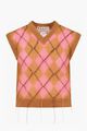 Marni blend sweater with all-over pink diamond pattern, tonal inset throughout, V-neck, short sleeves, straight hem worn at the bottom.
