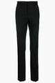 Slim cut wool trousers from Versace featuring black, virgin wool, logo patch to the rear, belt loops, hook and zip fly fastening, side pouch pockets, two rear welt pockets and slim cut.