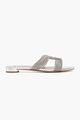 Silver calf leather crystal embellishment cut-out detailing open toe branded leather insole flat leather sole slip-on style.