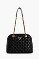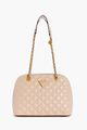 Dual shoulder straps. Top zip closure. Multiple internal compartments. Base: Quilted pebble. Trim: Pebble PU.