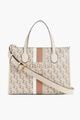 All Over Print. Shiny gold-tone hardware. Enameled triangle logo. Multiple interior pockets.