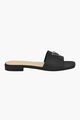 Faux-leather sandals. Checkered vamp with a signature triangle plaque. Square open toe. Low heel. Slide on.