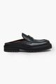 Smooth calfskin leather sabot. Penny loafer style. Metal piercing detail on the saddle strap. Leather insole. Chunky rubber lug sole. Made in Italy