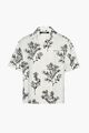 Black Flowers bowling shirt. Relaxed fit. Black Flowers printed lightweight linen. Camp collar. Boxy elbow-length sleeves. Embroidered logo. Back yoke with “J” locker loop. Mother-of-pearl buttons.